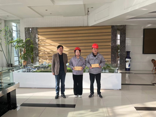 2023年11月15日下午3時,公司總經理張啟明向受到表彰的周陵元、賀慧玲給予現金獎勵,并與他們合影留念。